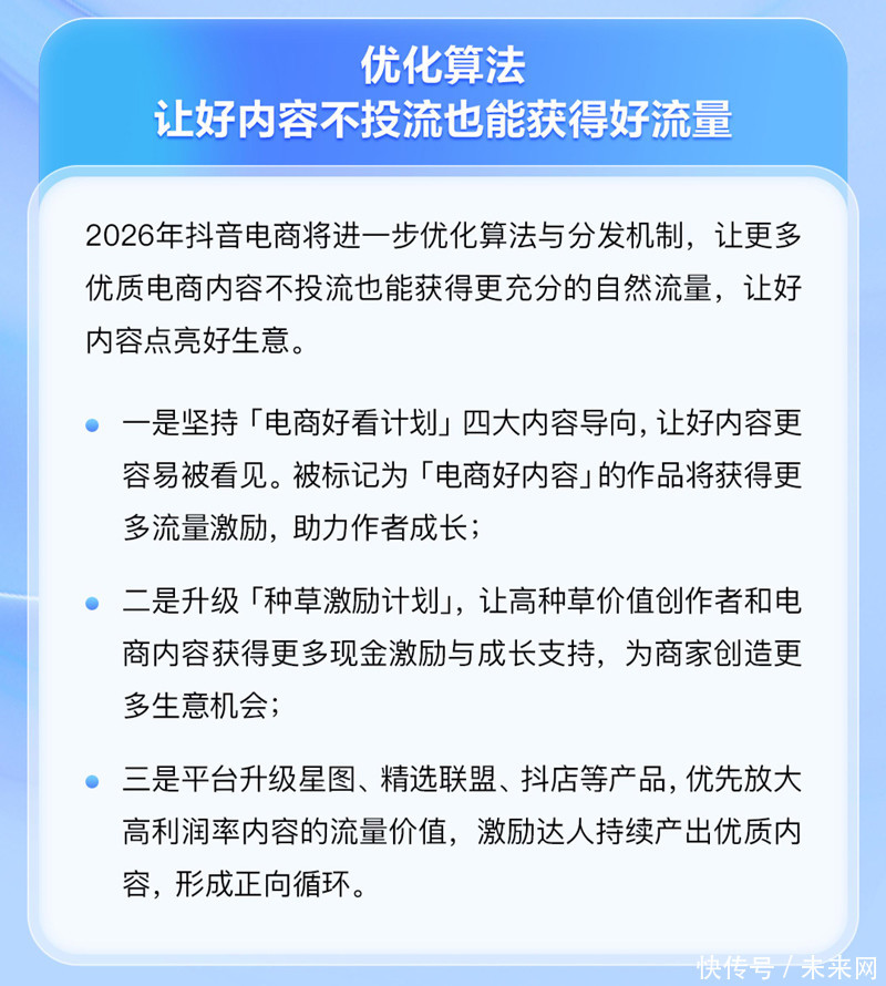 围绕流量获取与转化效率,平台将进一步优化算法与分发机制,引导流量向优质内容和高效供给倾斜。平台表示,将坚持“电商好内容”导向,对优质电商内容给予更多自然流量支持,并升级“种草激励计划”,通过现金激励和成长扶持,促进高价值内容持续产出。据了解,截至2025年底,种草激励计划吸引367万创作者参与,其中62万创作者生产的532万条视频获得分成激励,每日用户看视频后搜索支付GMV破亿元。