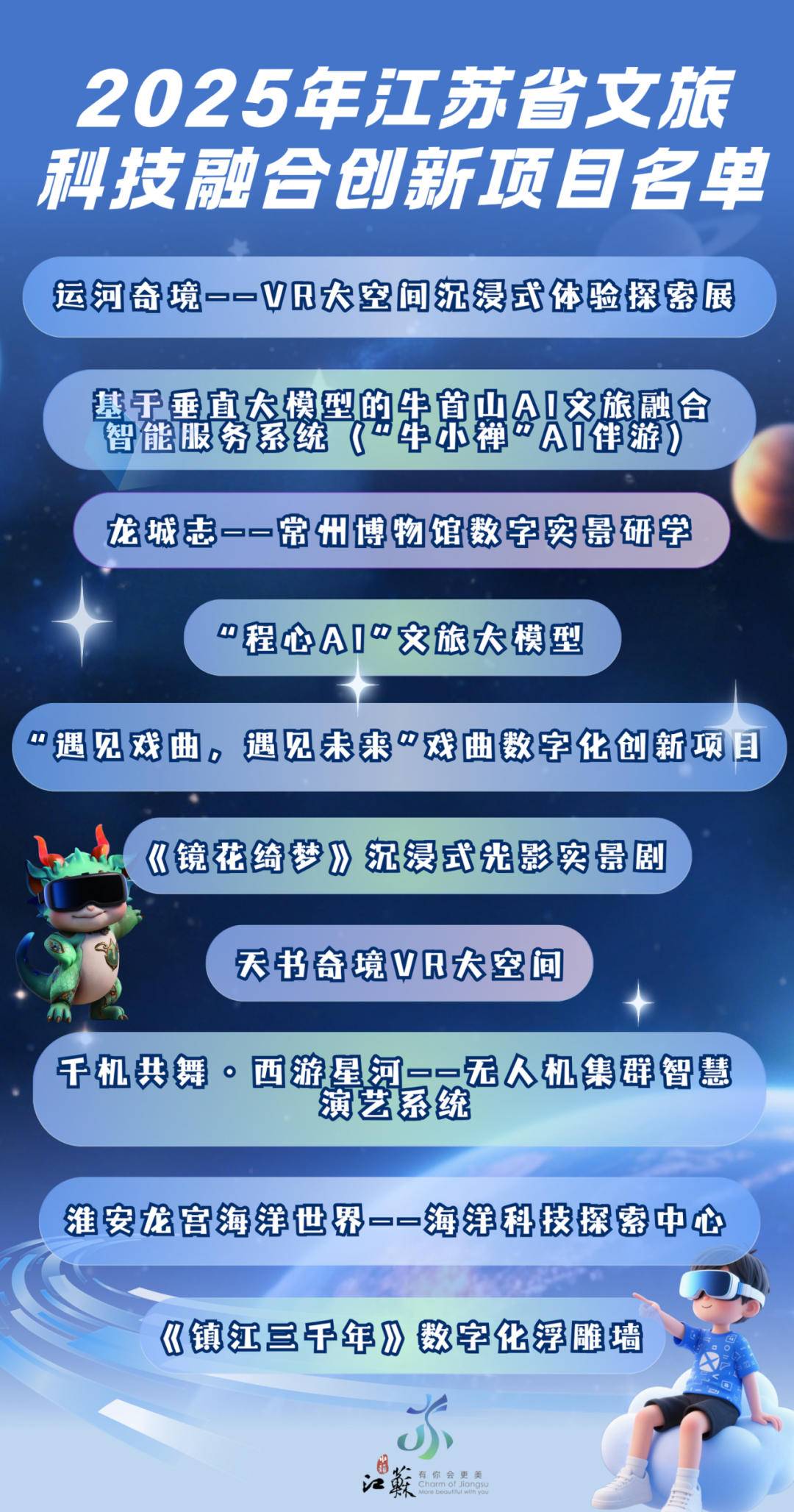 扬子晚报网10月10日讯(记者 金雨希)近日,江苏省文化和旅游厅正式公布2025年江苏省文旅科技融合创新项目名单,运河奇境——VR大空间沉浸式体验探索展、“牛小禅”AI伴游等10个项目成功入选。这批项目涵盖VR沉浸体验、AI智能服务、数字研学、光影演艺等多个领域,以科技赋能文化传播,为游客打造可感、可玩、可互动的文旅新场景。